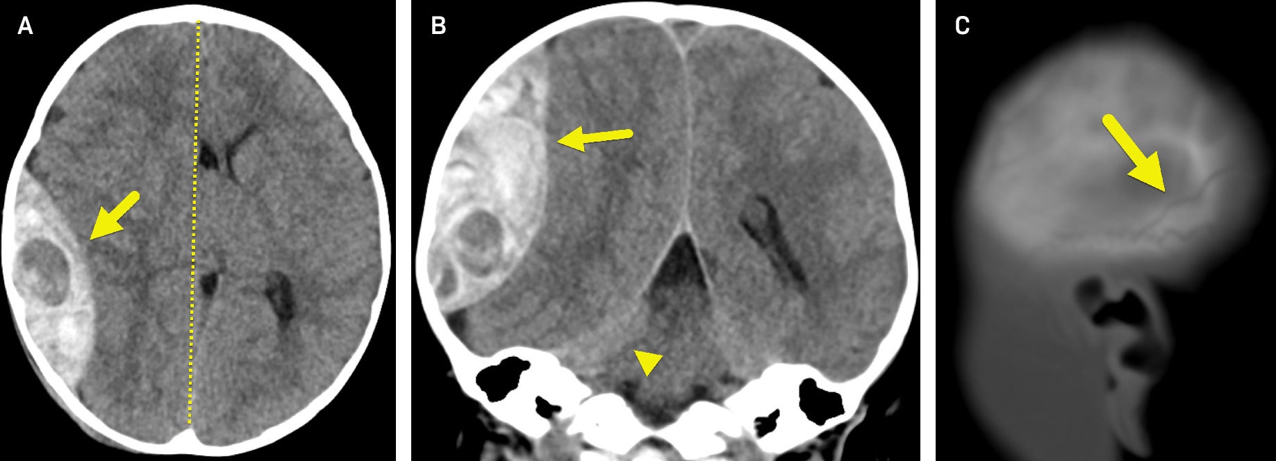 An EDH classically occurs as a result of a ruptured blood vessel within the epidural space. In adults, this usually occurs in the setting of a skull fracture and the associated rupture of the middle meningeal artery. In infants and young children, a fracture may or may not be present, and the source of bleeding is more likely to be venous. This is attributed to the plasticity of the skull, the abundance of the vasculature of the dura and growing skull bones, and the relative increase in size of the dural venous sinuses.1 The difference in vascular origin gives rise to more variability in the location of an EDH and the time to presentation, with a decrease in temporal hematomas and a higher incidence of hematomas in the posterior fossa and parieto-occipital regions.1, 6 Additionally, because infants have open fontanelles and sutures, the relative volume of EDHs, especially venous, is generally larger than in adults. This, along with the slower venous bleeds, accounts for the high incidence of concomitant anemia upon presentation.1
