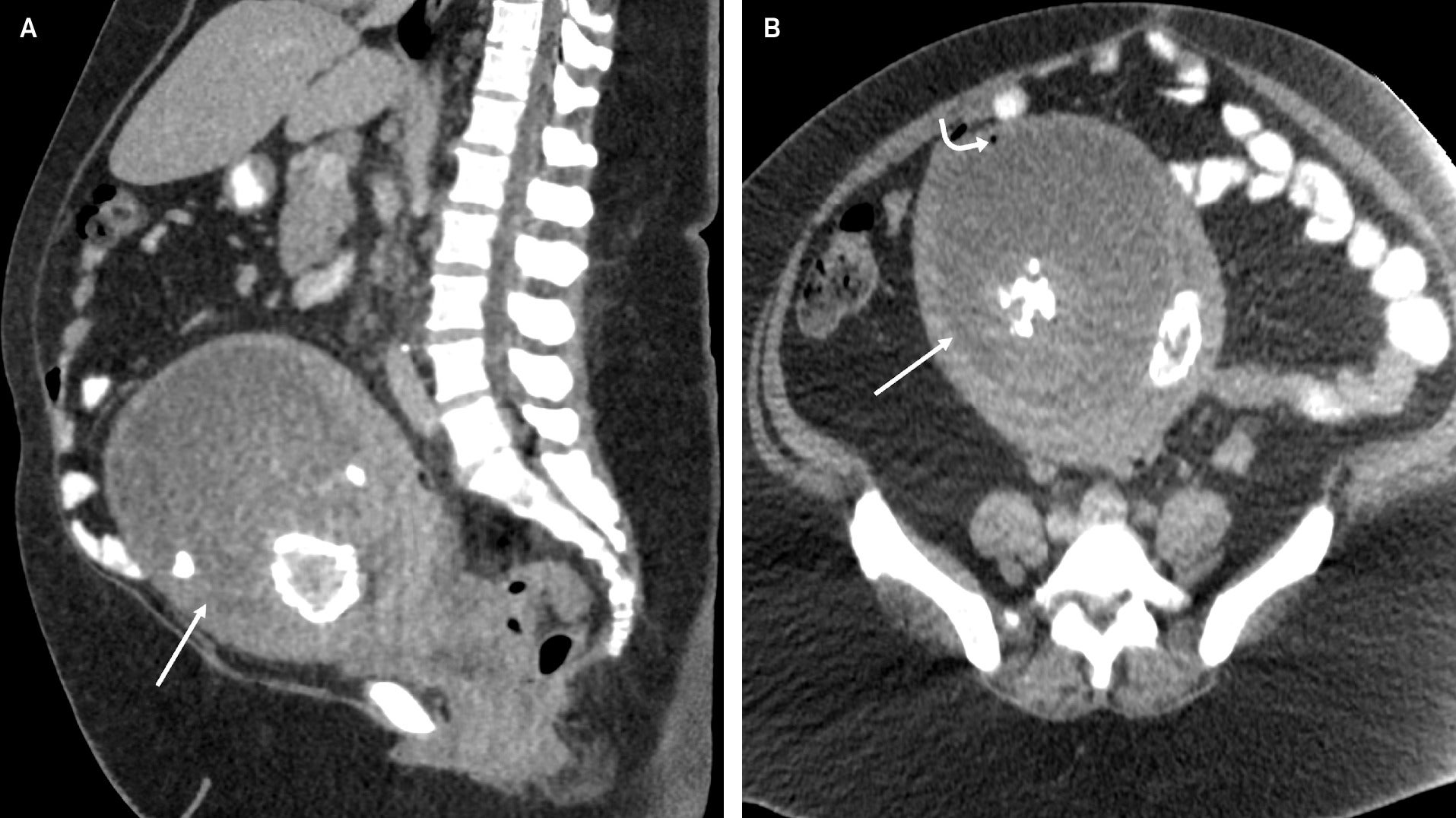 Sagittal (A) and axial (B) CT of the abdomen and pelvis after the administration of intravenous contrast shows an enlarged uterus with a centrally necrotic and partially calcified myometrial mass (straight arrow). There is a single locule of air within the necrotic portion of the fibroid anteriorly (curved arrow).