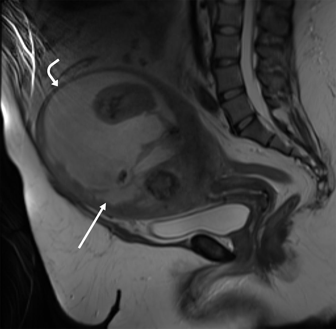 Sagittal T2-weighted MRI of the pelvis without intravenous contrast shows an enlarged uterus with a large, heterogeneous necrotic myometrial mass with cystic, solid, and calcified components (straight arrow). The small locule of gas visualized on the CT was not visualized at the time of MRI. There is marked myometrial thinning along the anterior and superior margins of the necrotic mass (curved arrow).