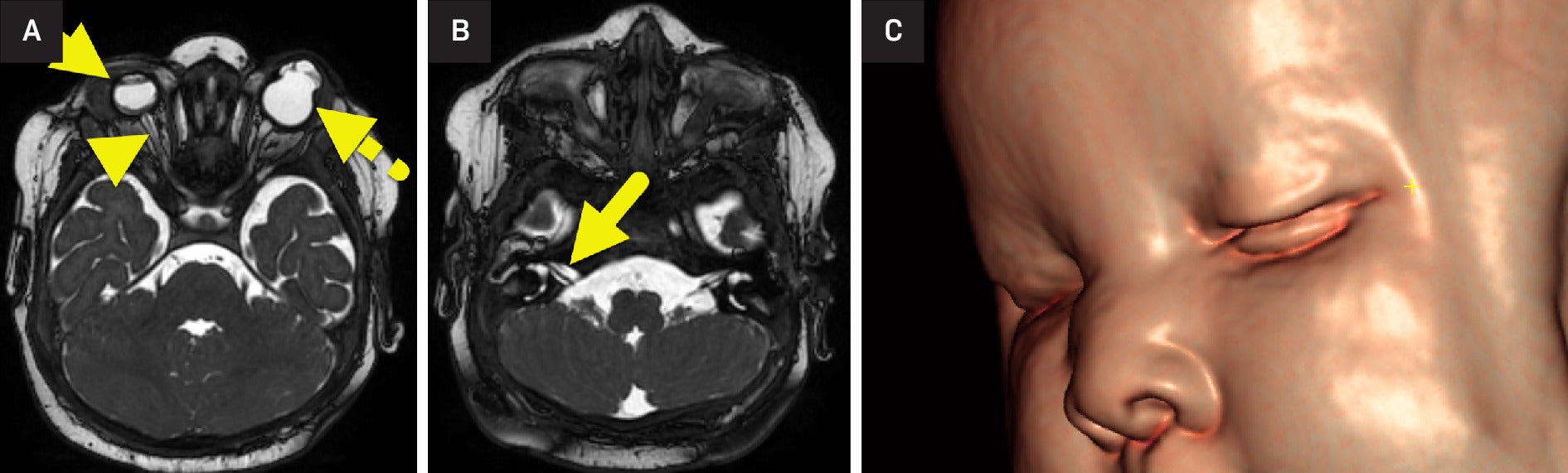 (A) MRI of the orbits shows right microphthalmia (arrow). The anterior chamber of the right globe is small, and the lens is absent. The right retina is detached, and the right optic nerve (arrowhead) is small. The left globe (dashed arrow) had a bilobed appearance with a cystic area extending in the region of the anterior chamber from the rudimentary orbit. (B) Images through the internal auditory canal show small cochlear nerves (arrow). (C) 3D reconstruction of the face shows a depressed nasal bridge.