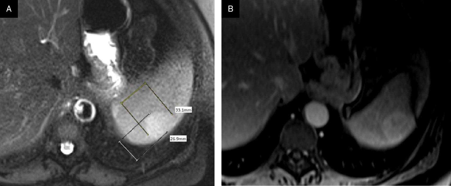 (A) T2 axial MRI demonstrates a mildly hyperintense 3.3 cm × 2.7 cm solitary lesion in the periphery of the spleen. (B) Post-contrast MRI scan in the portal venous phase demonstrates mildly heterogeneous enhancement.